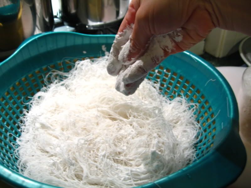 Đổ nước sôi vào rổ đựng bánh hỏi (đã ngâm 1 phút 15 giay)