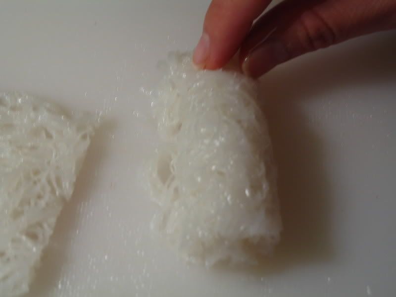 Lấy 1 cái dĩa lớn: xếp bánh hỏi ra từng lớp (nhớ lót giấy kitchen paper cho khỏi dính)